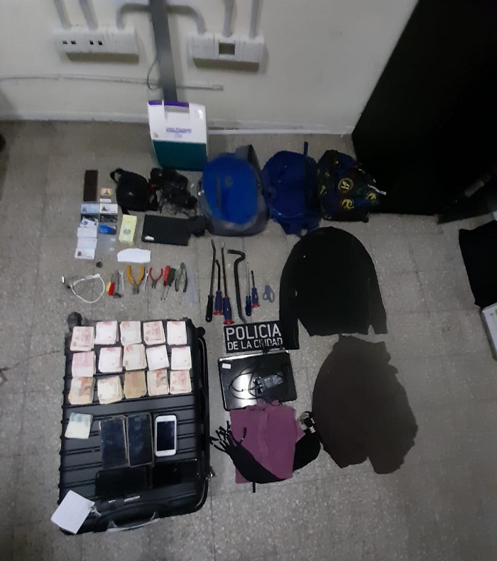 Además, a pocos metros del lugar había dos autos estacionados que tenían en su interior diversos elementos, entre ellos cinco celulares, dos mochilas con herramientas varias y una play station, además de la valija negra mencionada anteriormente que pertenecía al damnificado.