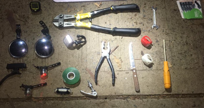Ante testigos fueron identificados los cuatro sospechosos, tres argentinos, uno de 20 y dos de 21 años, y un peruano de 29, a quienes se les hallaron distintas herramientas, entre ellas una gran pinza corta candado, una pinza común, destornilladores y una llave fija, utilizada para desarmar y cortar las bicicletas que robaban.