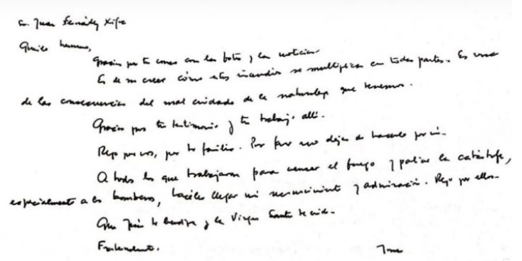 Al responder la carta, el Santo Padre agradeció las fotos y las noticias, por el testimonio y el trabajo del bombero, e hizo extensivo el saludo, enviando su bendición a los que «trabajan para vencer el fuego y paliar la catástrofe».
