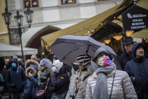 epa09565750 A Woman wearing a protective face mask looks around at the Old Town Square in Prague, Czech Republic, 05 November 2021. The current increase of Covid-19 cases across Europe is of 'grave concern', the World Health Organization (WHO) regional chief, Hans Kluge said 04 November. The continent could see half a million more deaths by February 2022, he said. Tests in the Czech Republic confirmed more then 8.000 new cases of Covid-19 last days and the number of people hospitalized with confirmed coronavirus infection is almost 2.500, the most in six months. EPA/MARTIN DIVISEK