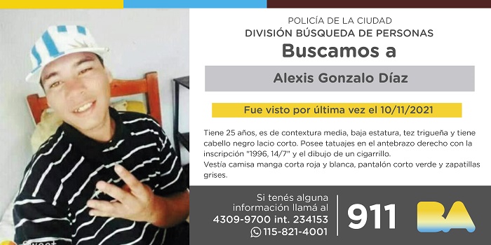 Se solicita a la población, en caso de contar con información sobre la persona buscada, contactarse de inmediato con el 911 o al 4309-9600, interno 234153, o por WhatsApp al 11-5821-4001.