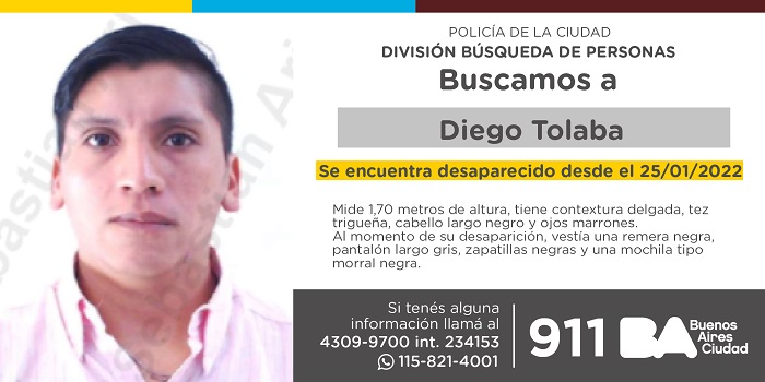 Tolaba fue visto por última vez el 25 de enero de 2022. Mide 1,70 metros de altura, tiene contextura delgada, tez trigueña, cabello largo negro y ojos marrones.