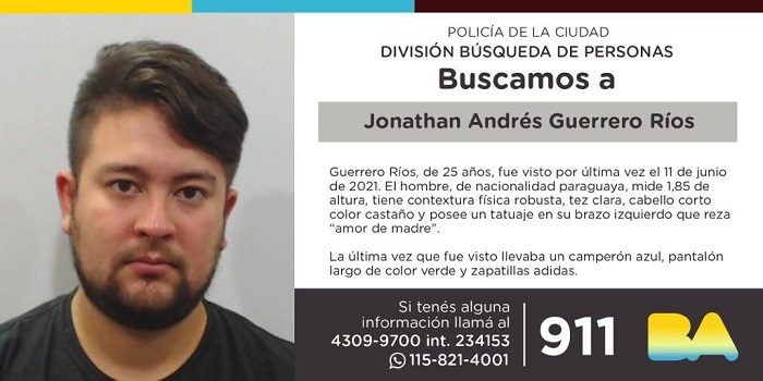 Guerrera Ríos, de 25 años, fue visto por última vez el 11 de junio de 2021. El hombre, de nacionalidad paraguaya, mide 1,85 de altura, tiene contextura física robusta, tez clara, cabello corto color castaño y posee un tatuaje en su brazo izquierdo que reza “amor de madre”.