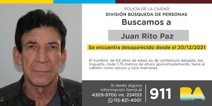 El hombre, de 64 años, se encuentra desaparecido desde el 20 de diciembre de 2021. Paz es de contextura física delgada, tez trigueña, mide 1,75 metros de altura aproximadamente, tiene el cabello corto oscuro y ojos marrones.