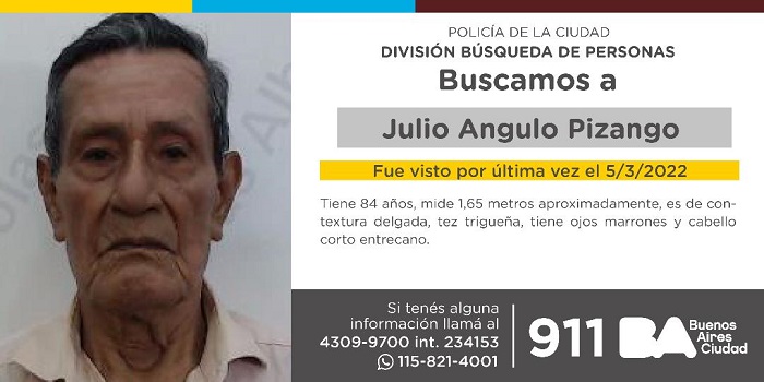 El hombre, de 84 años, fue visto por última vez el 5 de marzo de 2022. Mide 1,65 metros aproximadamente, es de contextura delgada, tez trigueña, tiene ojos marrones y cabello corto entrecano.