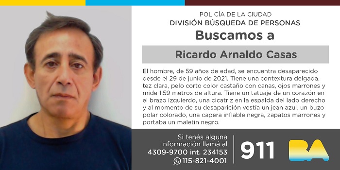 El hombre, de 59 años de edad, se encuentra desaparecido desde el 29 de junio de 2021. Tiene una contextura delgada, tez clara, pelo corto color castaño con canas, ojos marrones y mide 1.59 metros de altura.
