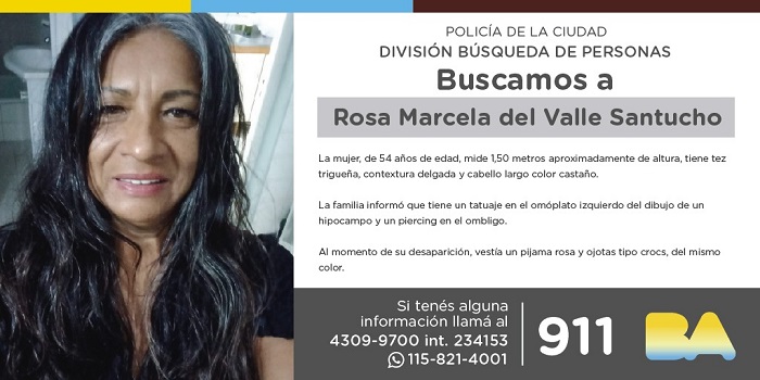 Se solicita a la población, en caso de contar con información sobre la persona buscada, contactarse de inmediato con el 911 o al 4309-9600, interno 234153, o por WhatsApp al 11-5821-4001.