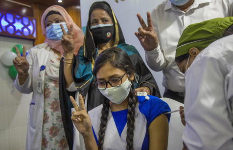 epa09557134 A Bangladeshi school student receives a first dose of the Pfizer COVID-19 vaccine at the Ideal School and College center in the Motijheel area of Dhaka, Bangladesh, 01 November 2021. According to the Bangladesh Directorate General of Health Services (DGHS), Bangladesh started administering coronavirus vaccines to school students aged 12-17. The Health Minister Zahid Maleque and education minister Dr. Dipu Moni inaugurated the campaign in Dhaka. EPA/MONIRUL ALAM