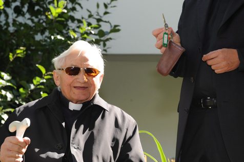 epa02338639 The brother of the pope Benedikt XVI and longstanding director of Regensburg's 'Domspatzen', Georg Ratzinger (R), sits in front of the private house of the pope next to director of the institute pope Benedikt XVI, Rudolf Voderholzer, in Pentling, Germany, 16 September 2010. The single-family house in Pentling is offered to the foundation Benedikt XVI. In the future, the house shall be in service of science. Joseph Ratzinger was professor at the University of Regensburg between 1969 and 1977. In these years he lived in the house in Pentling.Photo:?ARMIN?WEIGEL EPA/ARMIN WEIGEL