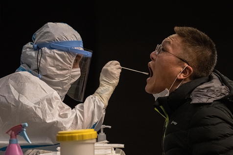 epa09064510 A reporter is tested for COVID-19 ahead of the the closing session of the Chinese People's Political Consultative Conference (CPPCC), in a hotel, in Beijing, China, 10 March 2021. China holds two major annual political meetings, The National People’s Congress (NPC) and the Chinese People's Political Consultative Conference (CPPCC) which run alongside and together known as 'Lianghui' or 'Two Sessions'. EPA/ROMAN PILIPEY